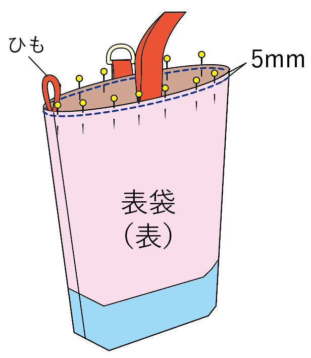 5ひもを表袋と内袋の間にはさんで、袋口まわりを縫います