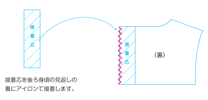 2-②後ろ身頃の見返しに接着芯を貼りジグザグミシンをかけます(2枚とも)。