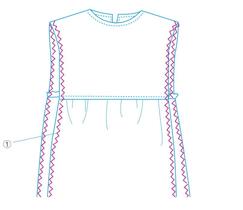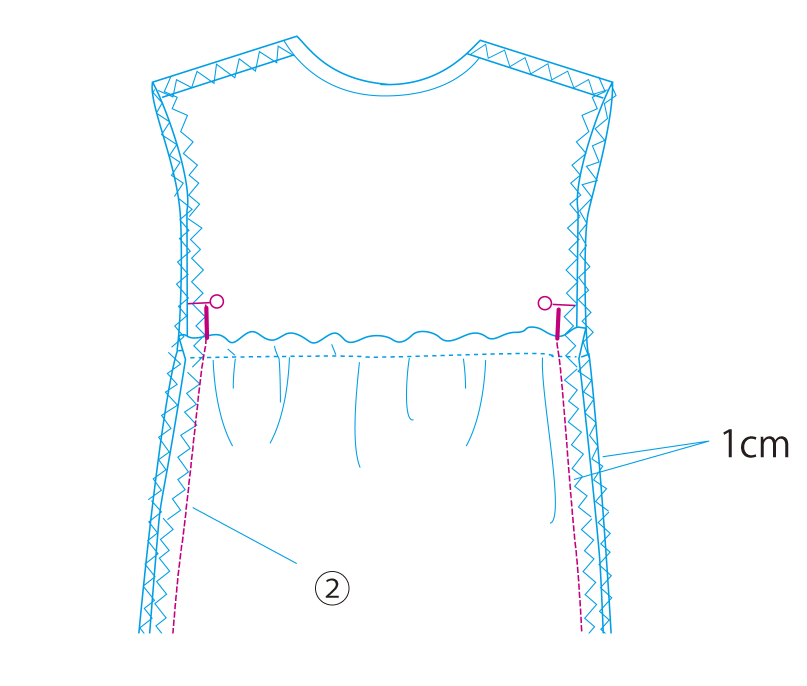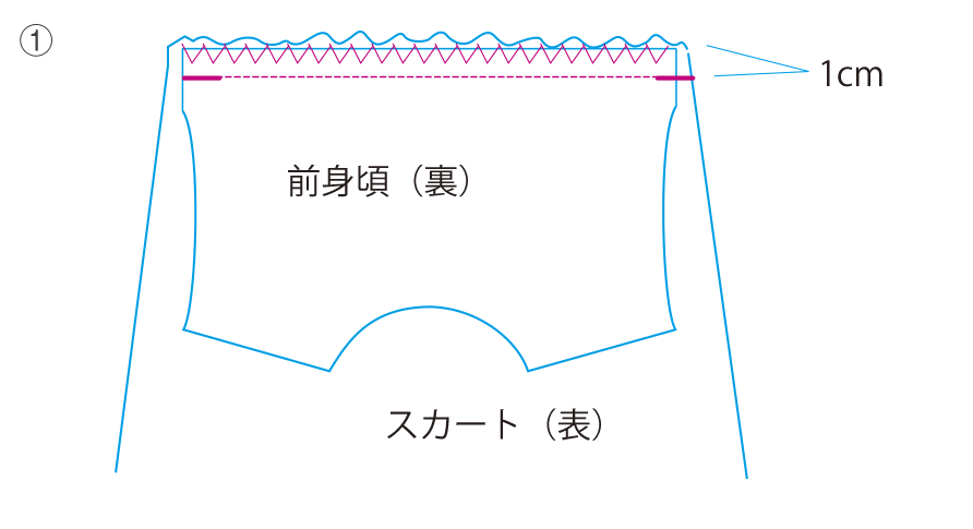 ①前身頃と前スカートを中表に合わせて縫い、