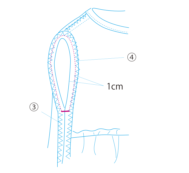 ④袖ぐりを縫います。脇の下は数回重ねて縫います。