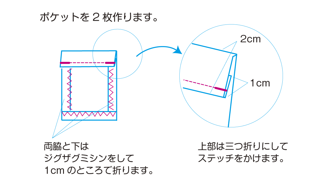 ぬいしろは2枚一緒にジグザグミシンをかけます。