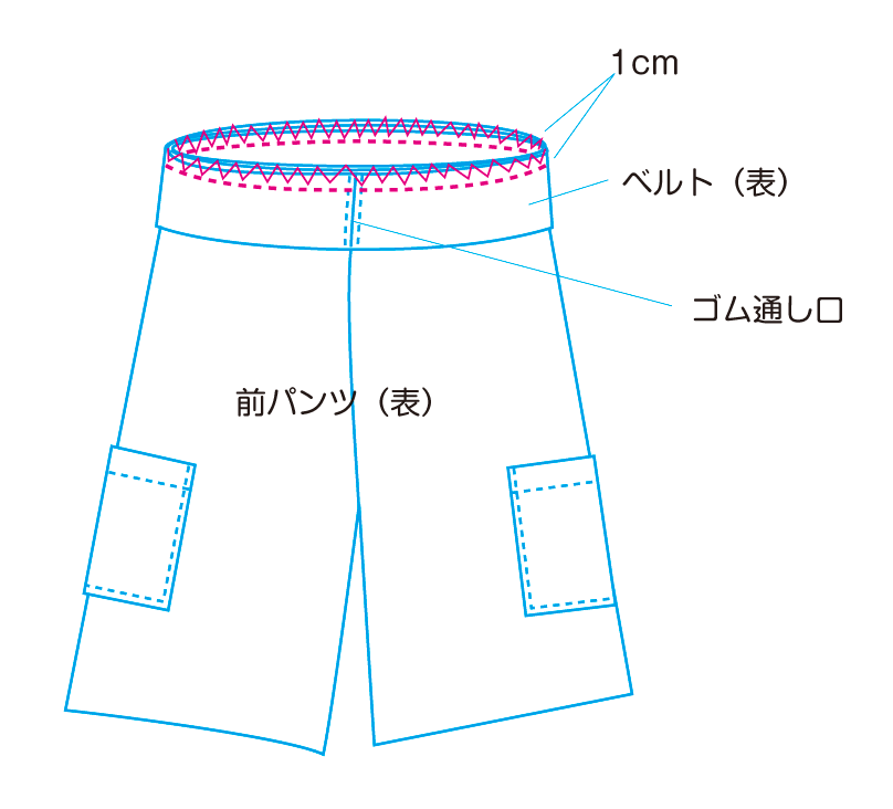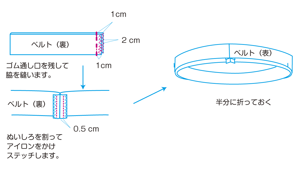 ゴムベルトを通したら、2cm重ねてミシンでとめます。