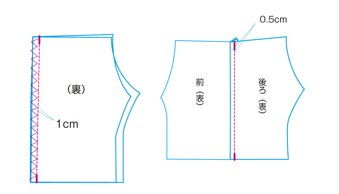前後パンツを中表に合わせてぬいしろ1cmで脇を縫い、ぬいしろ2枚一緒にジグザグミシンをかけます。