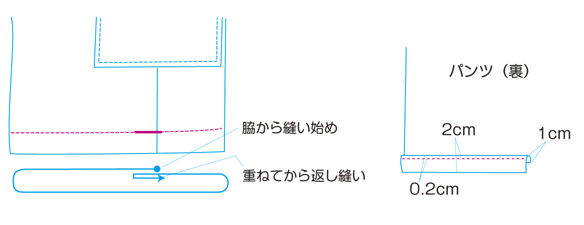 ぬいしろは後ろパンツ側に倒し、表側からステッチします。