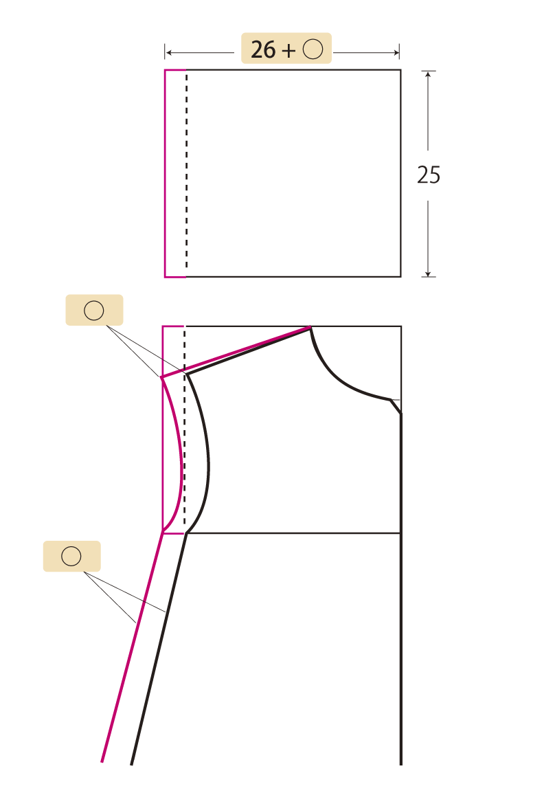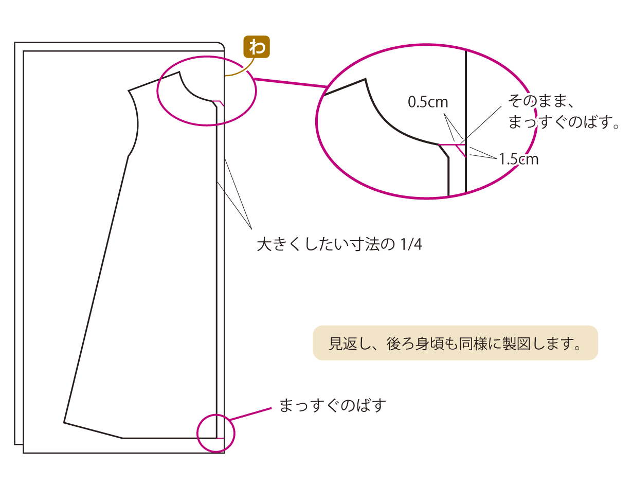 大きくしたい寸法の四分の一(例えば10cm大きくしたい場合は2.5cm)を最初に引く長方形にプラスして、肩側を広げて製図します。