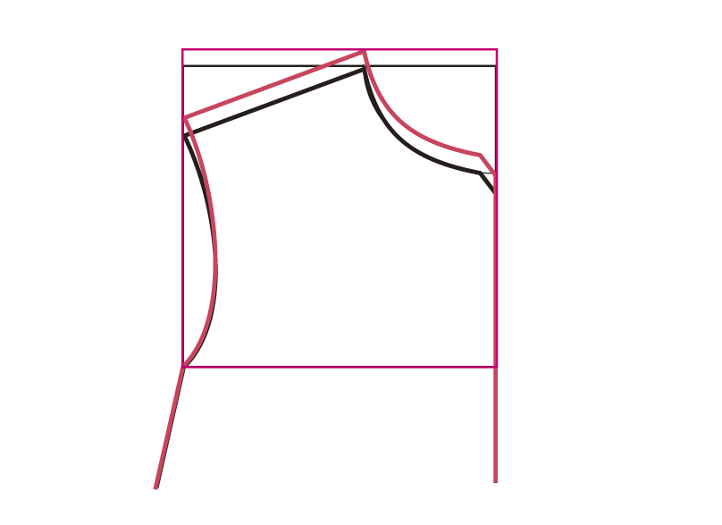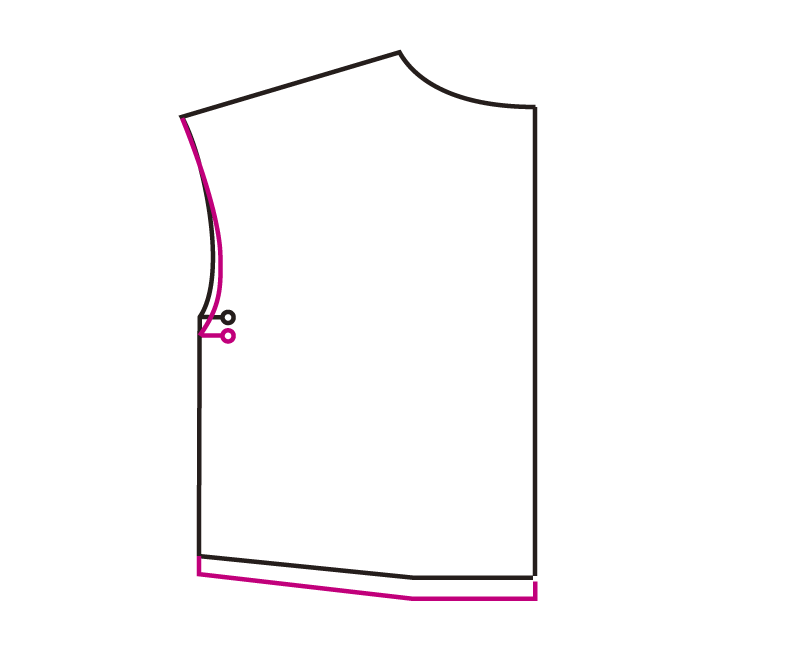 合印とウエストラインを同寸法下げて、袖のカーブを描き直します。1〜2cmが目安です。