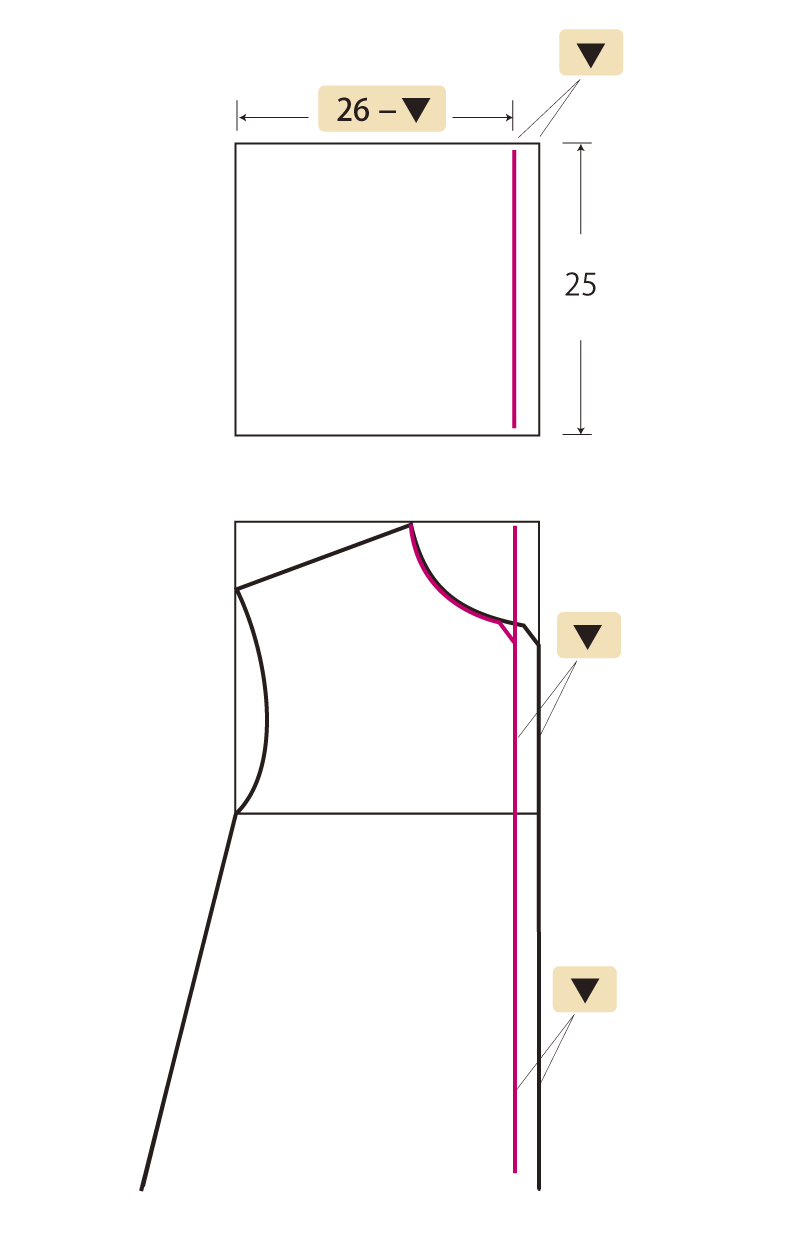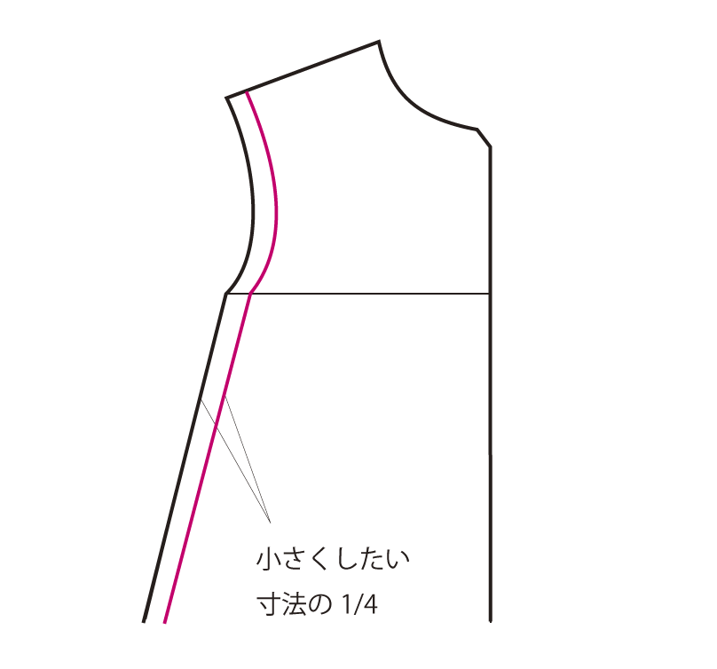 小さくしたい寸法の四分の一(例えば6cm小さくしたい場合は1.5cm)を最初に引く長方形から減らし、肩・袖はそのまま製図し、衿ぐりのカーブを調整して描きます。