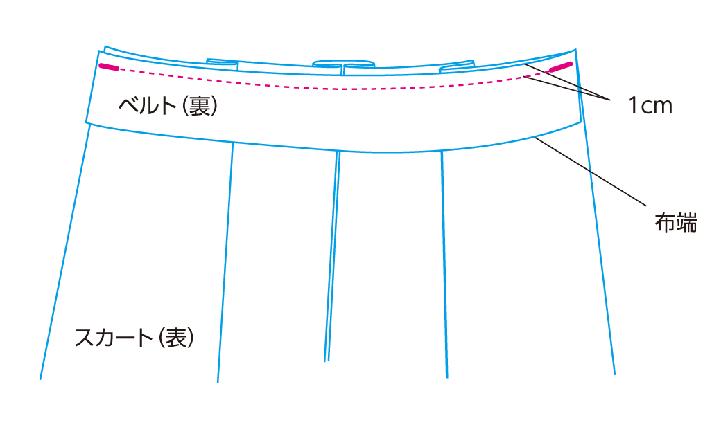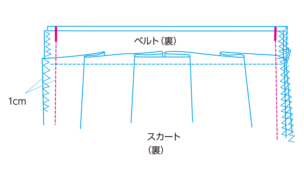 ベルトをアイロンでつけておいた折り目で折り、待針でとめて表から落としミシンをかけます。