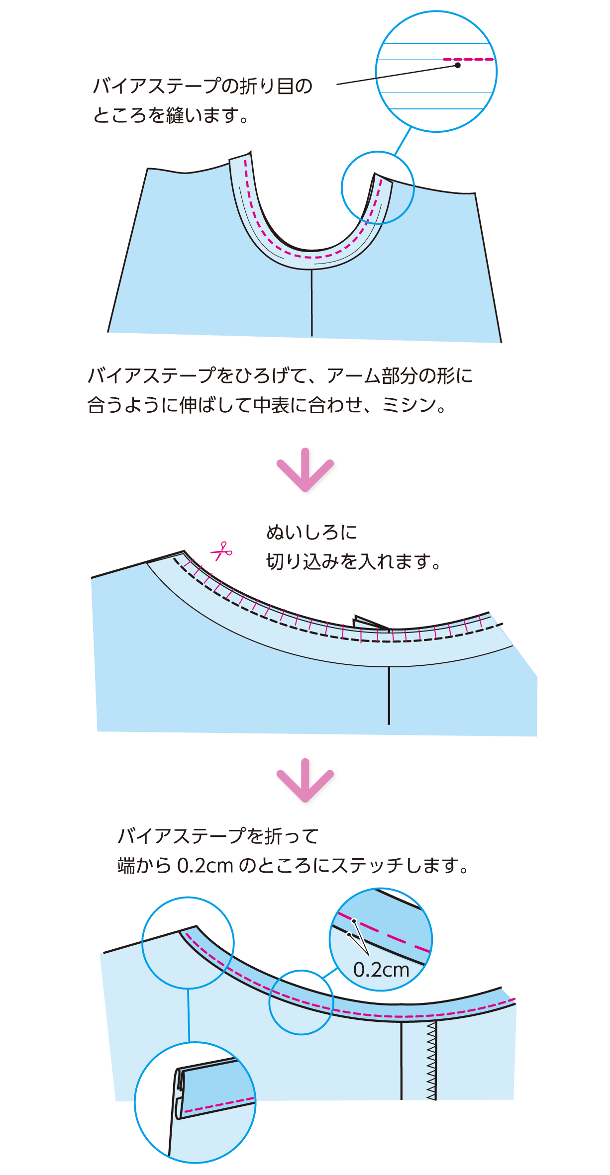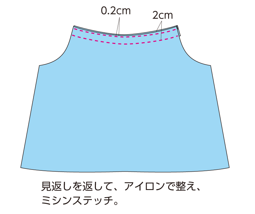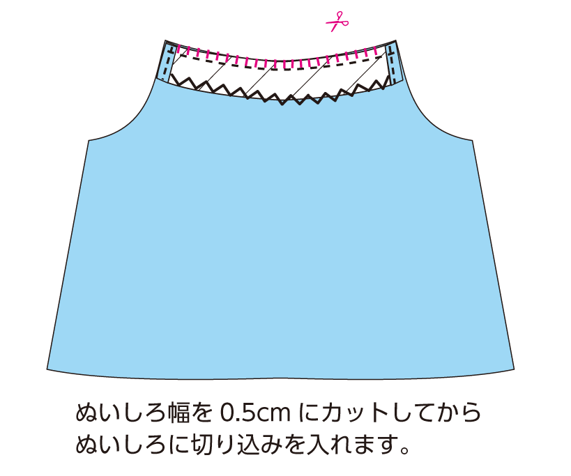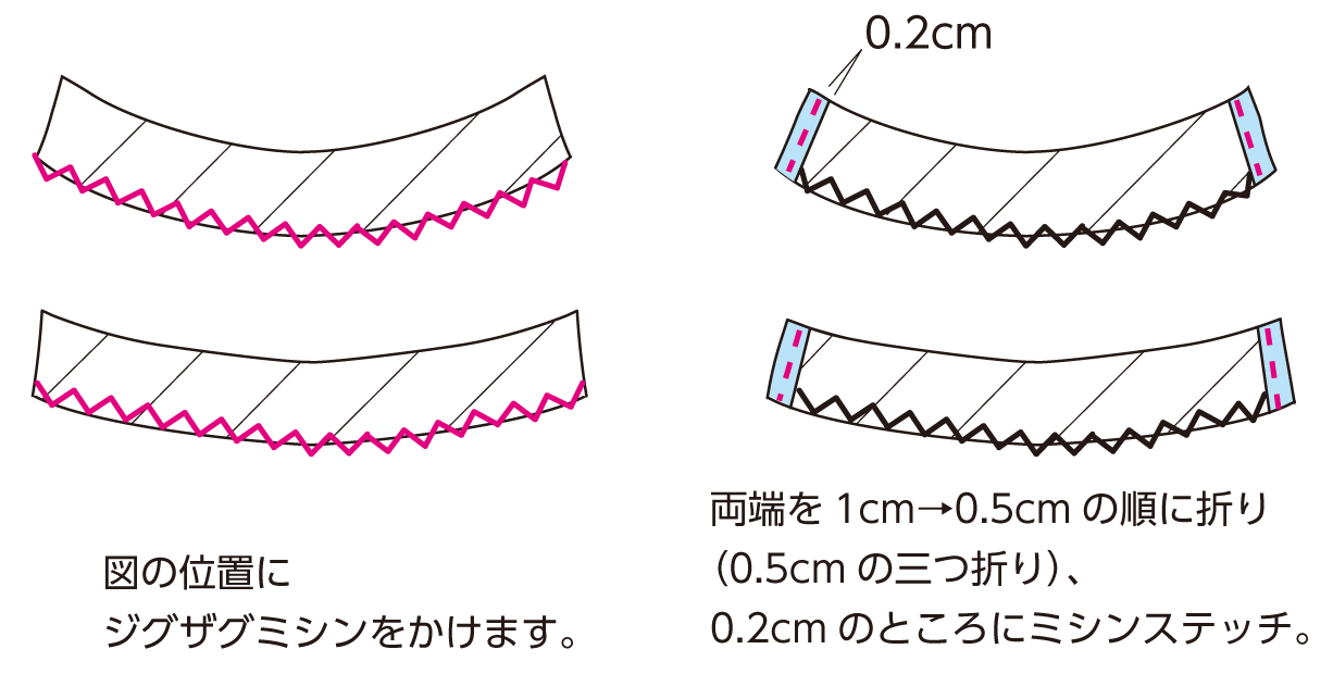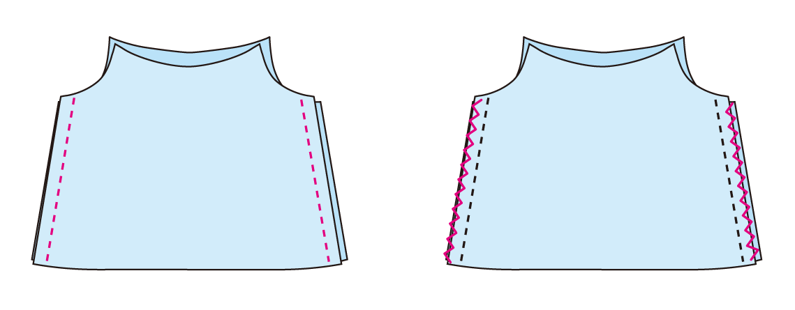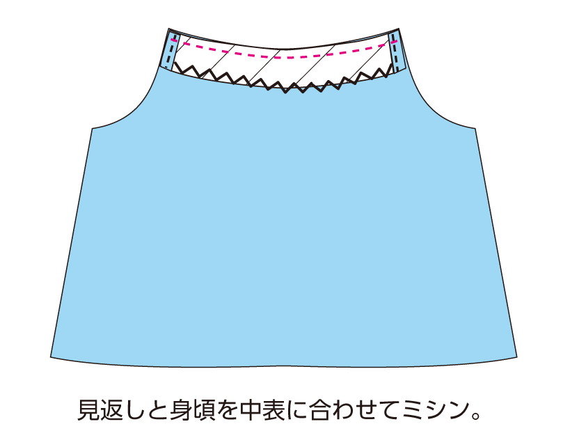 ぬいしろ、2枚一緒にジグザグミシンをかけます。ぬいしろは後ろ身頃に倒します。