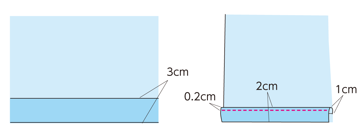 アイロン定規で3cm折り、次に2cm折って、0.2cmのところにミシンステッチ。