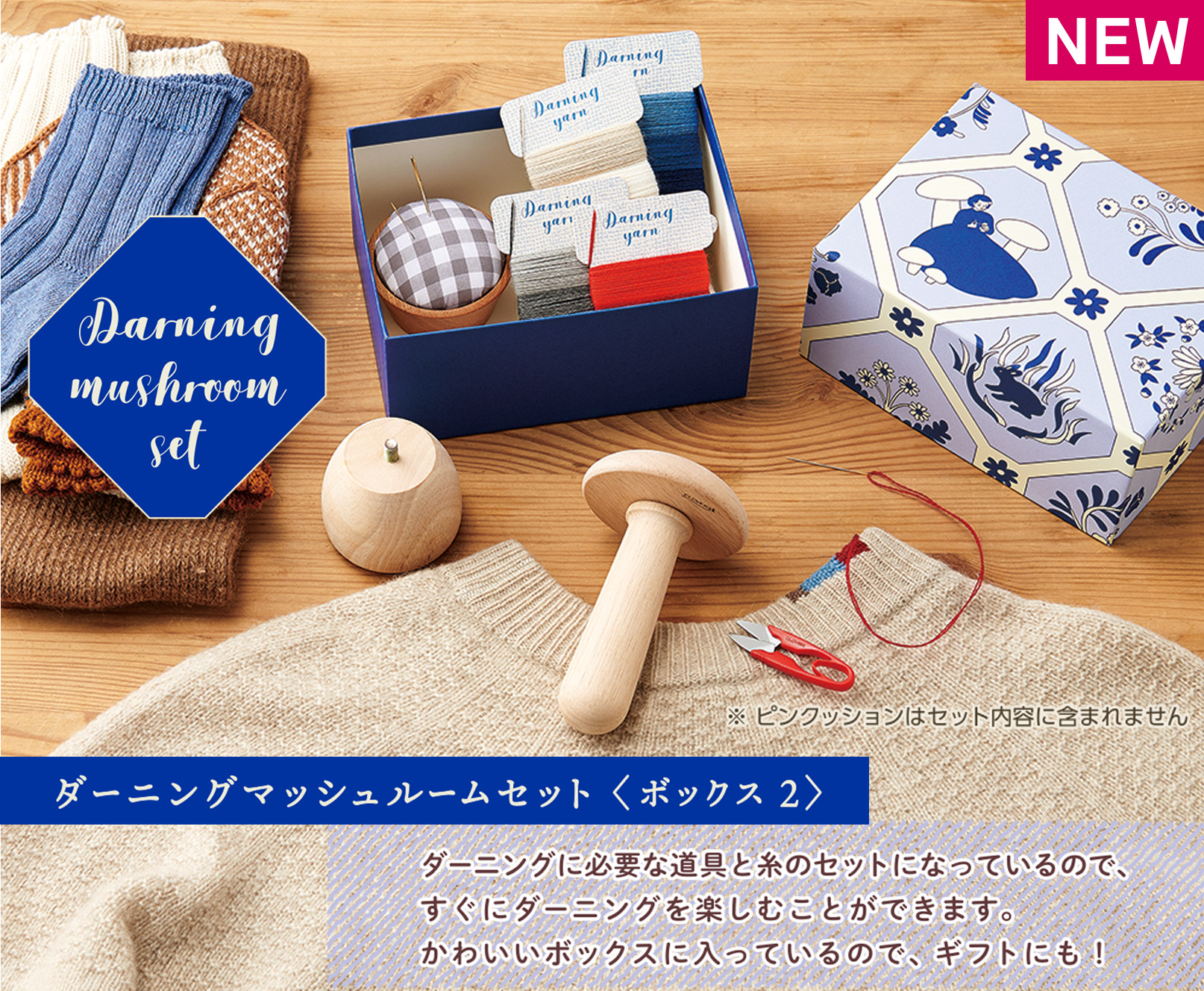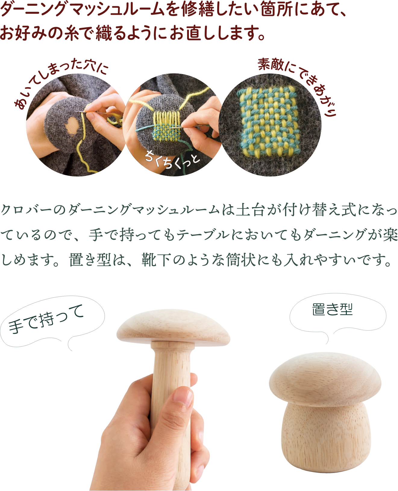 ヨーロッパで伝統的に行われている、衣類の穴あきやすりきれた箇所を修繕する針仕事です。そんなダーニングの作業に欠かせないのが、キノコ型の道具、ダーニングマッシュル-ム。マッシュル-ムで刺しゅうみたいに可愛くお直ししましょう。