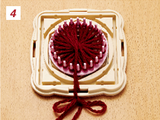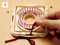 台に枠をセットし、台の切れ目に糸端を通して、その糸端を「あとでほどける結び方」で結んでおきます。 |