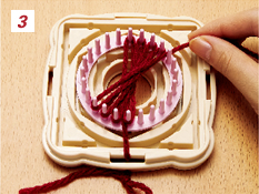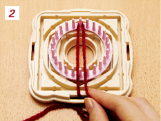 右回りにピン1本ずつ、対角線状に糸をかけていきます。糸がゆるまないように一定の強さでかけていきましょう。 |