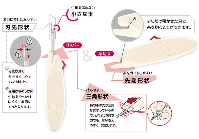 はさみでは切りにくいボタンの糸切り、縫い目、しつけ糸の糸切りに便利です。長い方の先を糸の下に差し込み、押すようにして使います。 生地を痛めない小さな玉を付けています。
