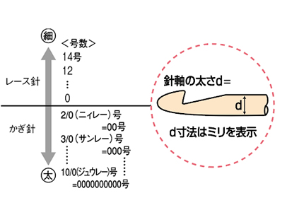 レース針は0号が一番太く、号数が大きくなるほど細くなります。0号より太い針をかぎ針と呼び、00(ニイレー)号・000(サンレー)号と太くなって、2/0(ニイレー)号、3/0(サンレー)号と表示します。クロバーでは、号数とともに国際標準規格のミリ表示を併記しています。