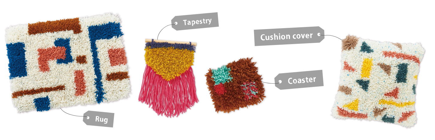 毛糸や好きな糸をカットして、専用フックでメッシュに結びつけていくだけで