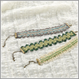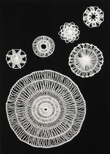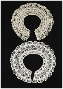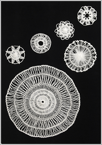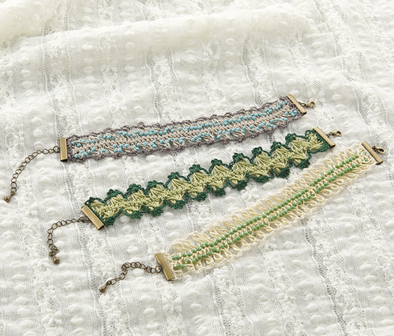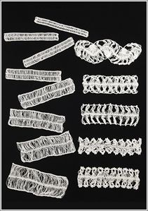 編み器に糸を巻きながら、かぎ針やレース針で止めていく技法です。ヘアピンレース編みでは2~8cm(1cm単位)のテープ状のブレードが編め、これをつないでレース地を作ります。