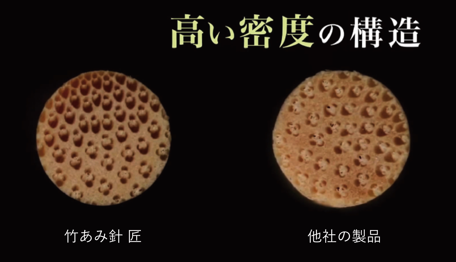 編み針として最も適した4、5年ものを冬場に伐採し繊維が密集した竹の皮近くの、硬く粘りがある最適な部分を