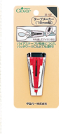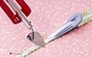 ![]() 目打などを使い、テープメーカーWに生地を差しこみます。上の溝にキルト用熱接着テープを通します。 |