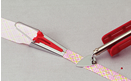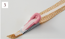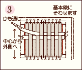 ![]() はさみ式のひも通しを使って、横のテープを1本おきに通し、2本目以降は交互に見えるように通します。 |