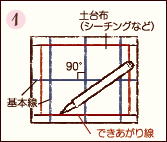 ![]() 土台布(生地のシーチングなど)に水性チャコペンで90°に交わる基本線を引きます。 |