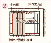 ![]() アイロン台の上に土台布を置き、縦のテープを並べます。引っぱりすぎないよう注意して、上下の端を2cm残して待針でとめます。 |