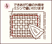 ![]() 縦、横のテープをきちんと90゜に整えてからアイロンで接着し、できあがり線の外側をミシンで縫い付けます。 |